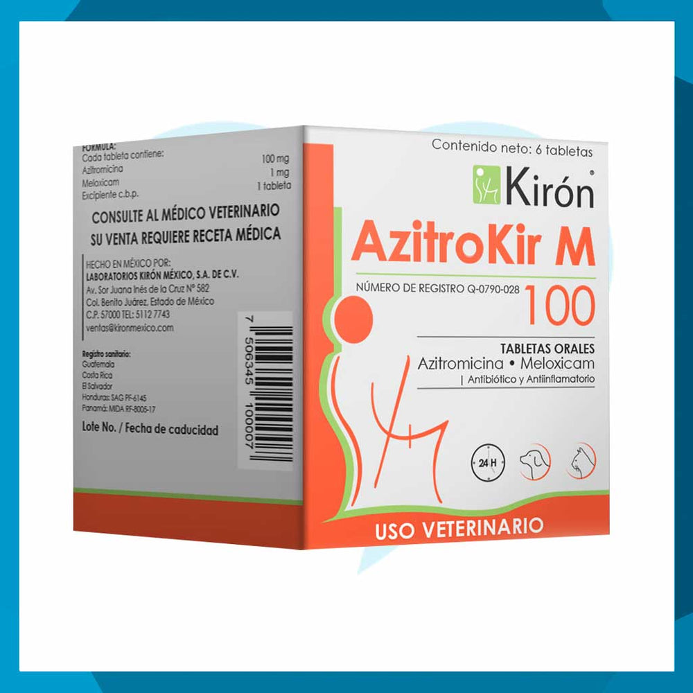AzitroKir M 100 mg en caja de 6 tabletas es un antibiótico veterinario de amplio espectro diseñado para tratar infecciones bacterianas en perros y gatos. Su fórmula de azitromicina optimiza la absorción, garantizando un efecto prolongado con una sola dosis diaria. Requiere receta médica veterinaria vigente para su adquisición. En Pet Protect ofrecemos este producto con garantía de calidad y asesoría profesional.