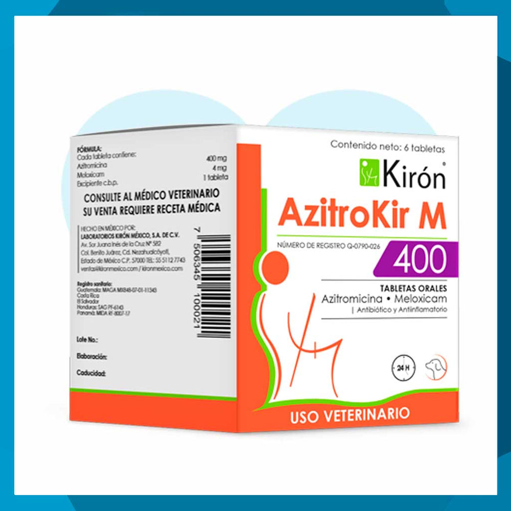AzitroKir M 400 mg es un antibiótico veterinario de alta eficacia indicado para el tratamiento de infecciones bacterianas en perros y gatos. Cada caja contiene 6 tabletas con fórmula optimizada para garantizar absorción y acción prolongada. Su uso requiere receta médica veterinaria vigente, asegurando un manejo responsable y profesional. En Pet Protect ofrecemos productos de calidad comprobada para el bienestar de tu mascota.