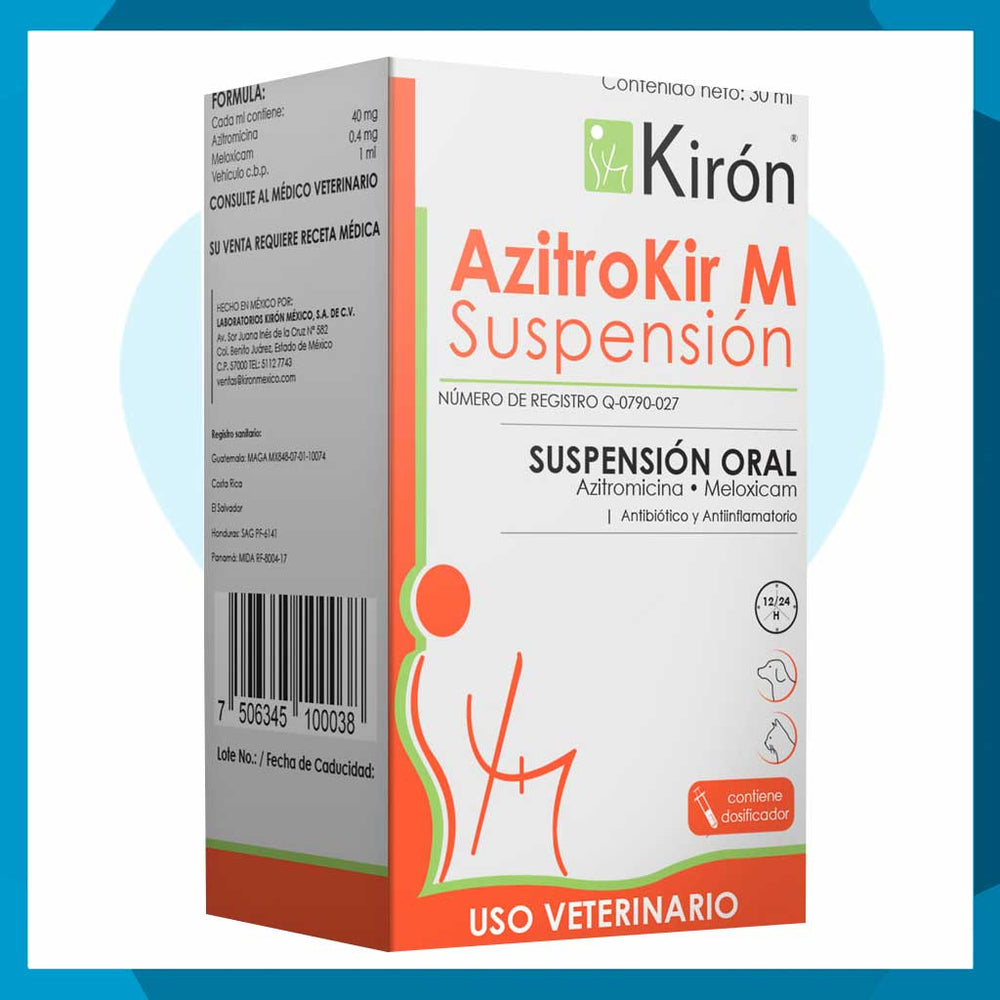 Azitrokir M suspensión oral 30 ml es un antibiótico veterinario de amplio espectro formulado para tratar infecciones en perros y gatos. Su presentación líquida facilita la dosificación y la administración oral. Requiere receta médica veterinaria vigente. En Pet Protect garantizamos productos seguros, calidad comprobada y envío rápido.