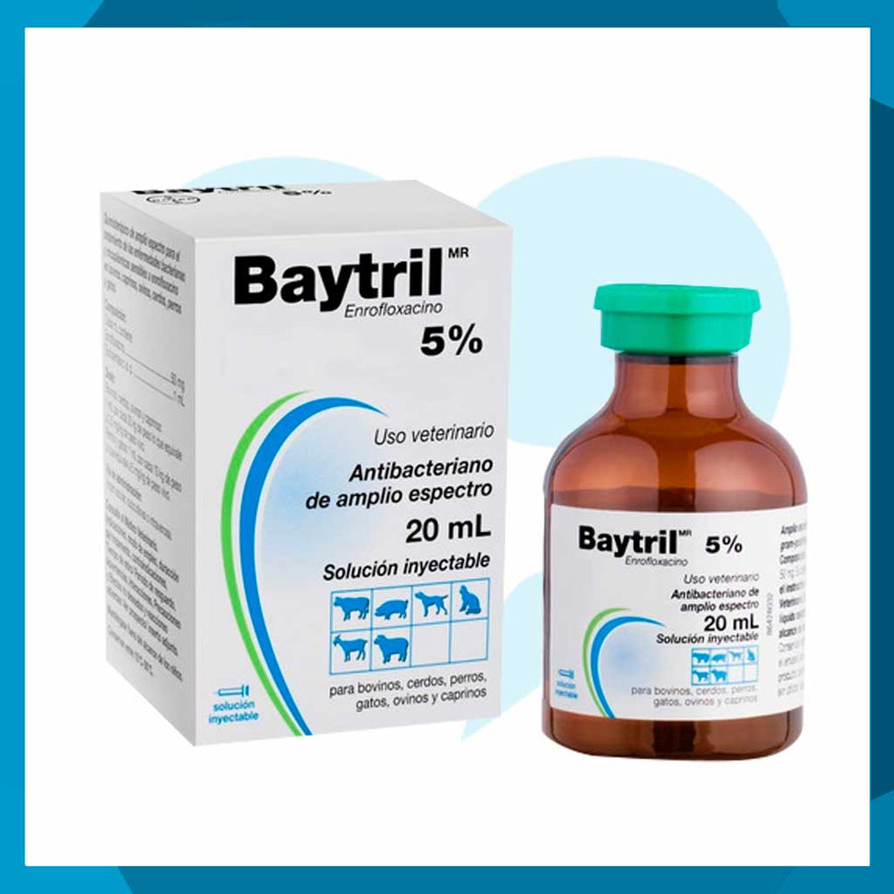 Baytril 5% Solución Inyectable 20ml es un antibiótico de amplio espectro para uso veterinario. Su fórmula concentrada asegura una rápida absorción y acción contra infecciones bacterianas. Es ideal para perros y gatos bajo supervisión profesional. Con instrucción precisa del veterinario, se obtiene un tratamiento eficaz y seguro. Compra hoy este tratamiento en Pet Protect.