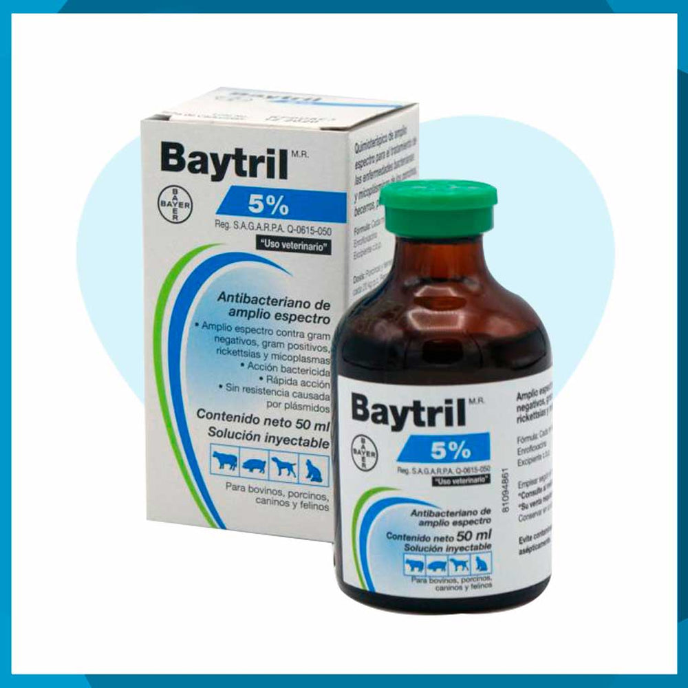 Baytril 5% solución inyectable 50 ml es un antibiótico veterinario de amplio espectro, ideal para tratar infecciones bacterianas en perros y gatos. Su concentración al 5 % garantiza una administración precisa y rápida absorción. Fabricado bajo estándares de calidad, ofrece efectividad comprobada y mínima irritación en tejidos. Este producto está formulado para aplicarse de manera segura en clínica o en casa bajo supervisión veterinaria.