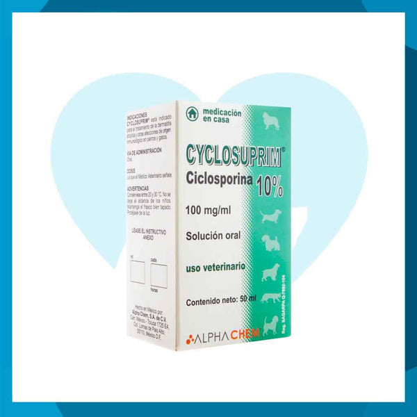 Cyclosuprim 10% Solución Oral es un medicamento veterinario diseñado para el tratamiento de enfermedades inmunomediadas en perros y gatos. Su fórmula concentrada garantiza una dosificación precisa y eficaz bajo supervisión profesional. Este producto requiere receta médica veterinaria vigente para su venta. Ofrece una presentación en frasco de 50 ml que facilita su administración y conservación. Confía en Pet Protect para adquirir Cyclosuprim con garantía de origen y calidad.