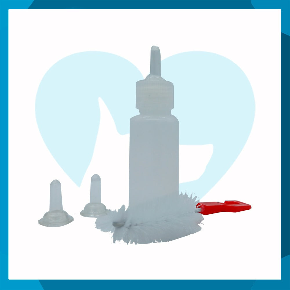 El kit contiene tetinas de silicona suave, biberón de vidrio resistente y adaptadores de diferentes calibres. También incluye un cepillo de limpieza y tapas de seguridad. Cada componente cumple con normas de calidad alimentaria y no libera tóxicos. El set está diseñado para uso profesional y doméstico. Ideal para veterinarios y criadores exigentes.