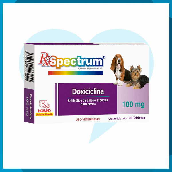 Rx Spectrum Doxiciclina 100 mg caja de 20 tabletas es un antibiótico de amplio espectro diseñado para el tratamiento de infecciones bacterianas en mascotas. Su fórmula garantiza una rápida absorción y liberación estable del principio activo. Ideal para perros y gatos bajo prescripción veterinaria. Cada tableta contiene la dosis precisa para asegurar eficacia y seguridad. Confía en Rx Spectrum para mantener la salud de tu mascota.