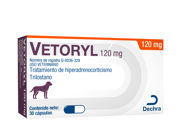 Vetoryl 120 mg se utiliza para el tratamiento del síndrome de Cushing en perros, reduciendo la producción excesiva de cortisol y controlando los síntomas asociados.