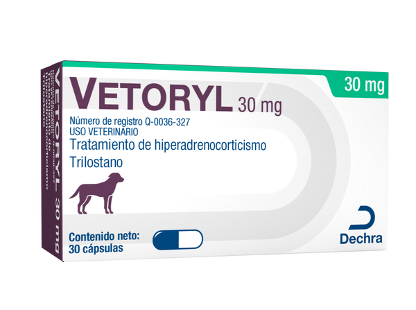 Administra Vetoryl 30mg por vía oral, siguiendo la dosis que indique tu veterinario. Se recomienda dar la cápsula junto con la comida para mejorar su absorción. Ajusta la dosis según control veterinario y analiza los niveles hormonales cada mes.