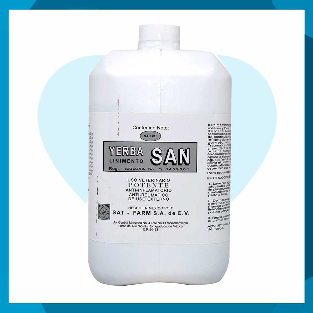 Encuentra Yerba-San Linimento Tapa 940ml en Pet Protect, tu tienda online de confianza. Aprovecha envíos rápidos y empaques seguros. Disfruta de promociones exclusivas al registrarte. Consulta nuestro catálogo para comparar precios y disponibilidad. Compra con garantía de calidad y satisfacción.
